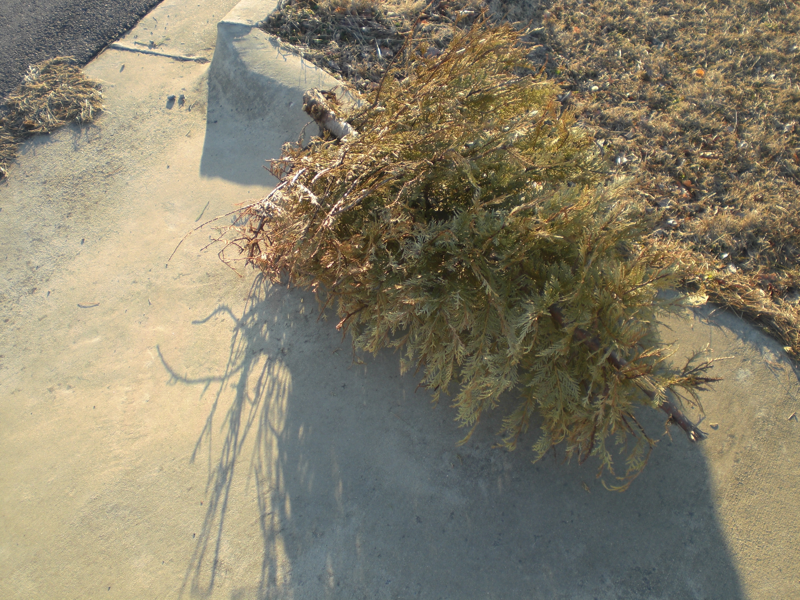 1) The wind blew it out of sight for several weeks. Then the wind coincidentally blew it right back in our driveway. The thing is, this tree is solid enough that it would take a severe thunderstorm/small tornado to lift it off the ground- both times. There has been snow, but definitely no strong enough winds to move the tree twice.