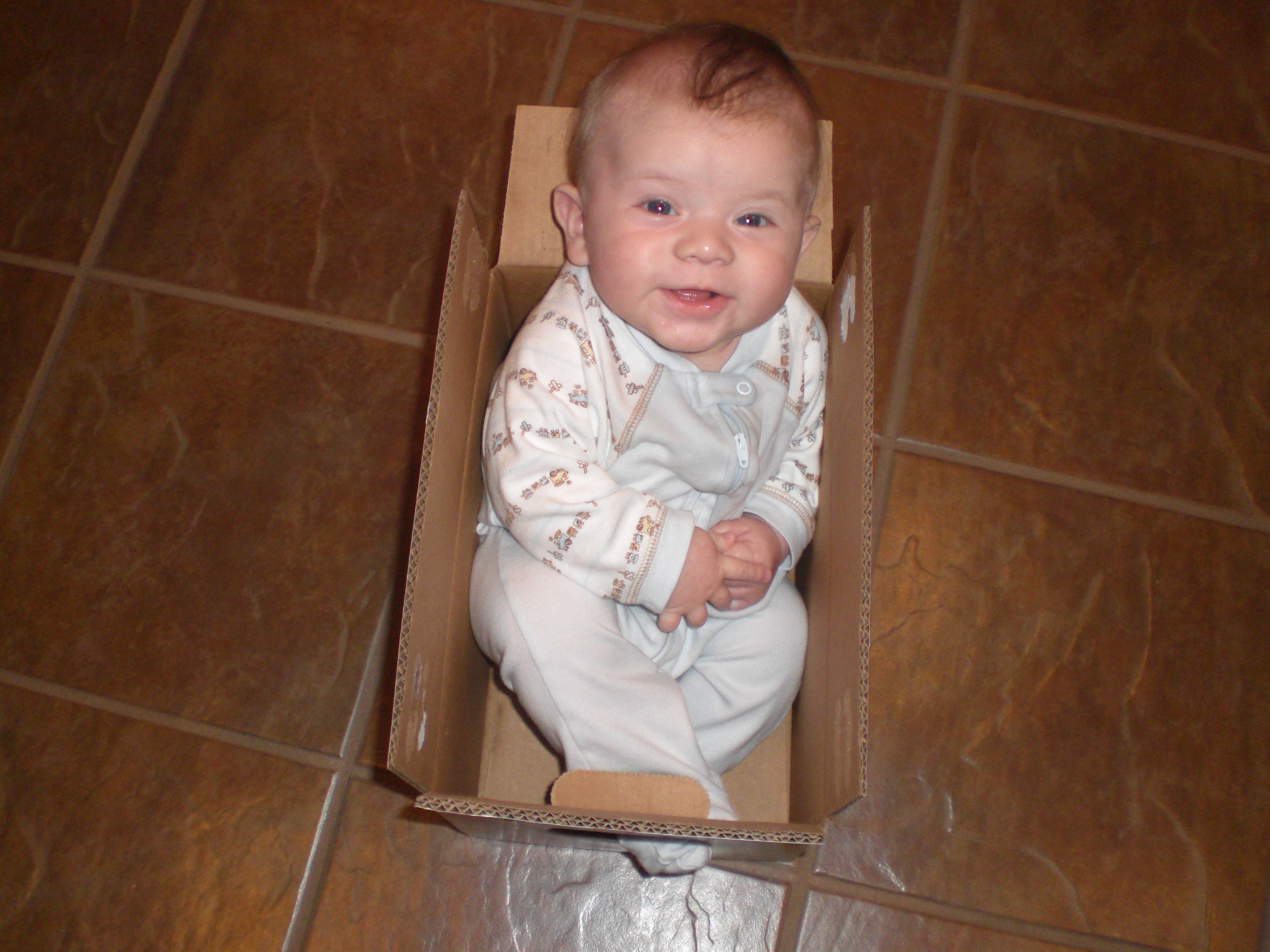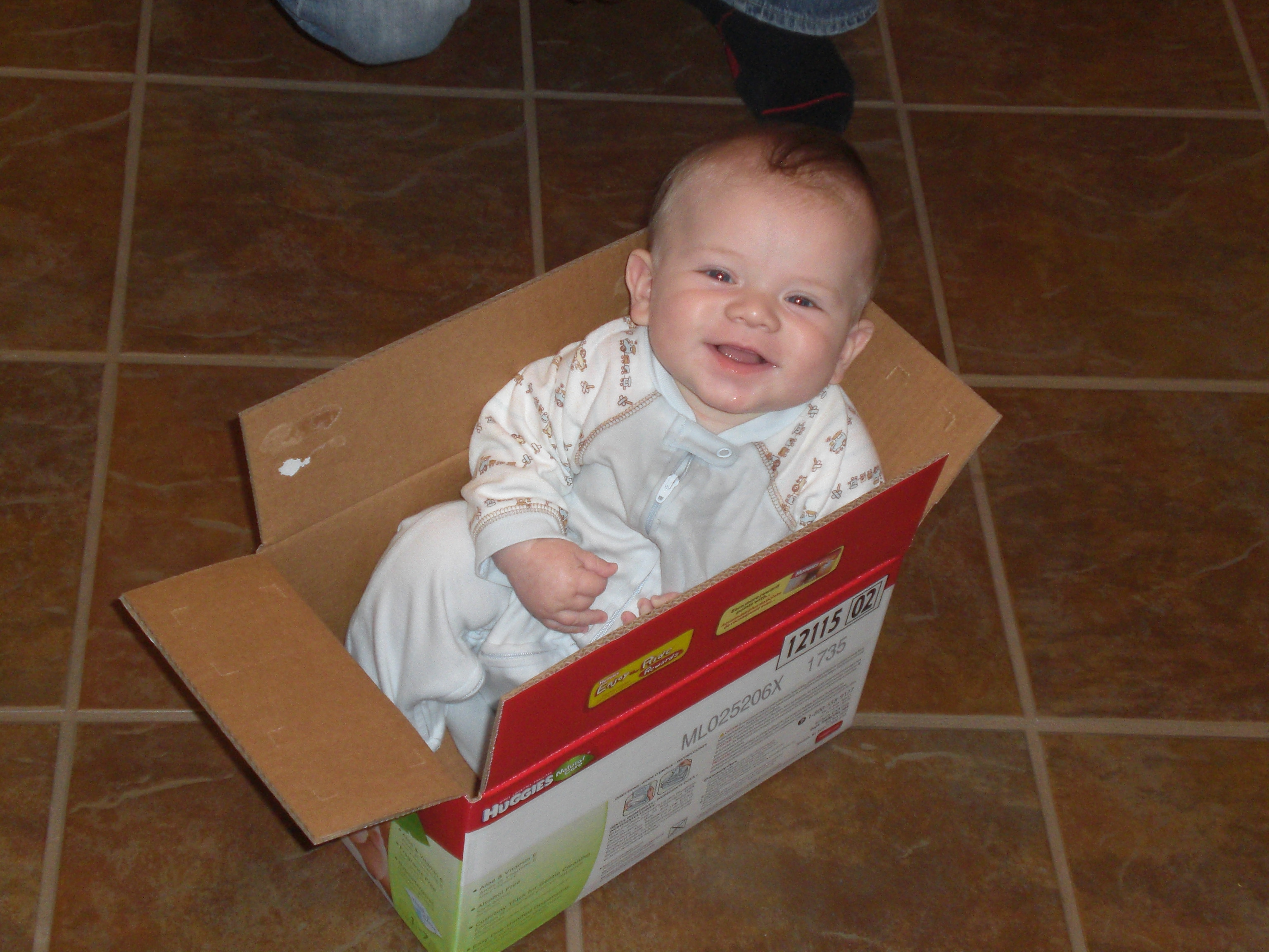 Everyone is familiar with the idea of a young child being more excited about the box that a gift came in than the gift itself. Jack’s diaper box is no different. If it were up to him, he would just go around naked all the time. And if it weren’t for that whole “not potty trained yet” thing, I’d be okay with it. Earlier this week I saw him eyeing the empty Huggies box, ready for garbage take-out. So I dropped him it, turned on the engine, and as expected, he loved his new ride.