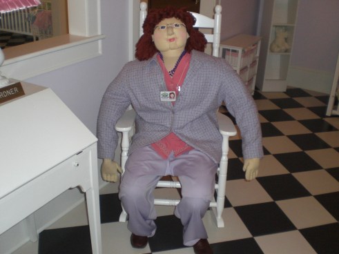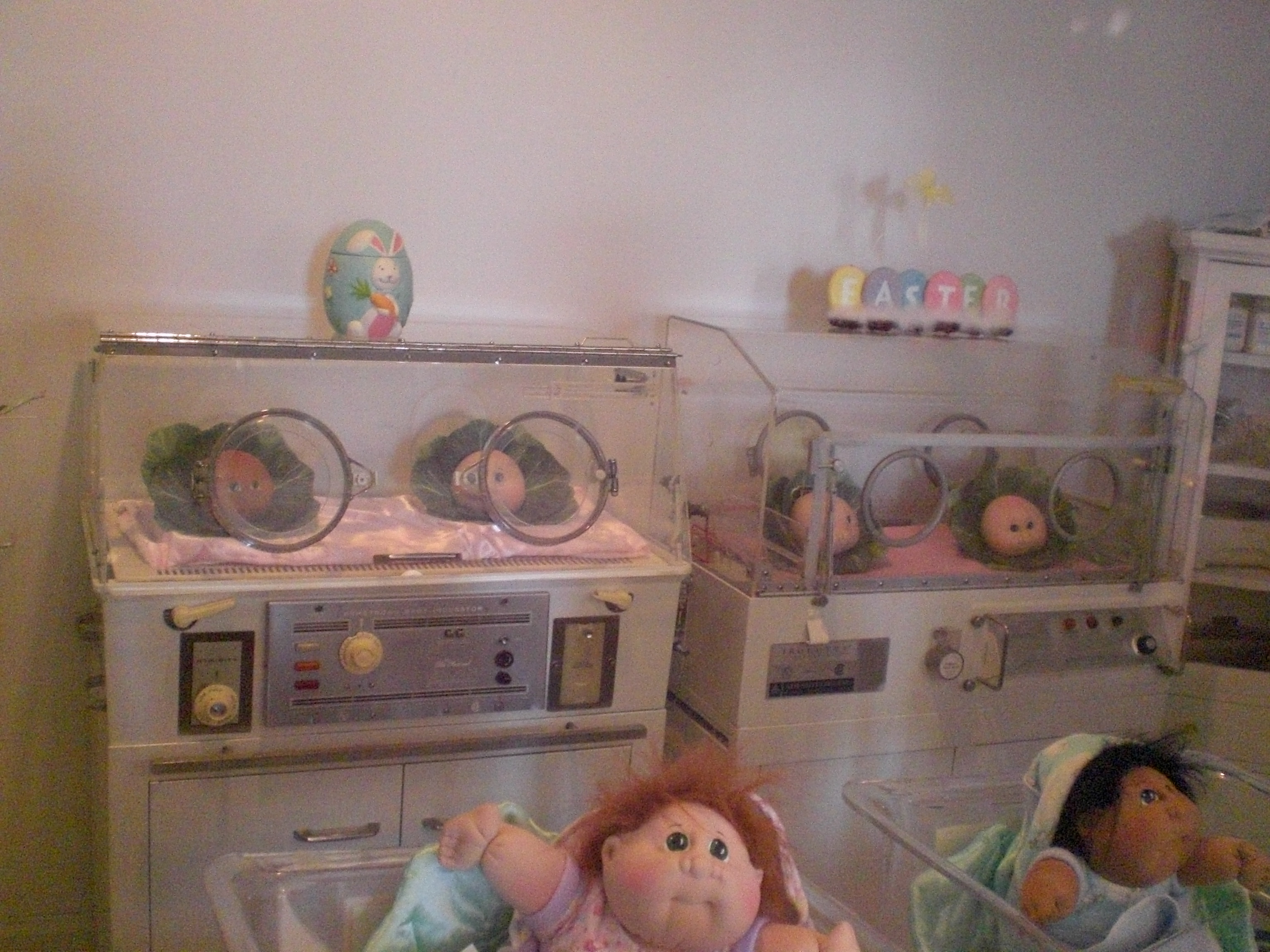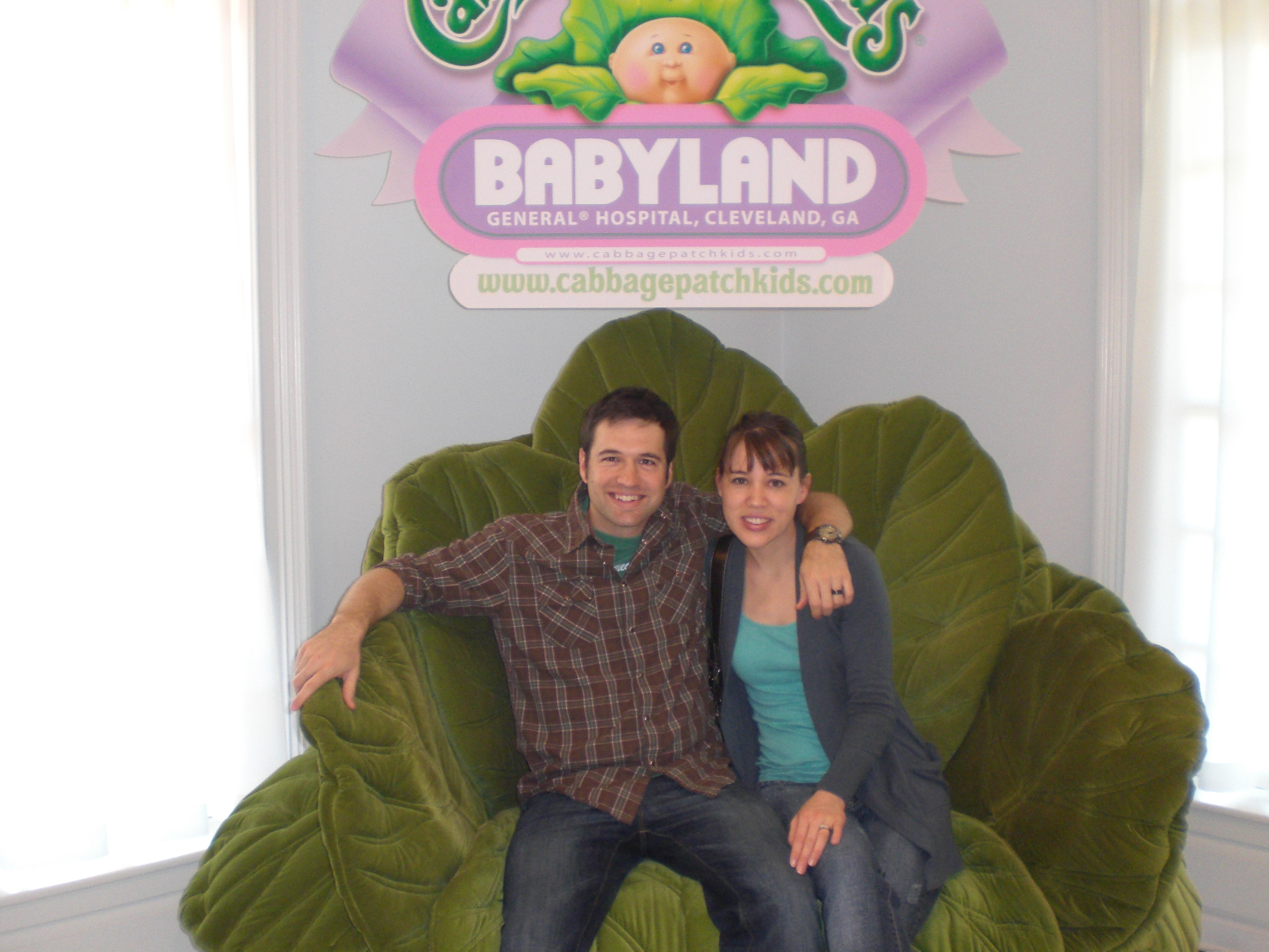 I will just say this right off the from the start: I highly recommend going to Cabbage Patch Kids Babyland.  First of all, it’s free admission.  Granted, it’s sort of out in the middle of nowhere, but for us, that was part of the allure.  The building itself is a new, beautiful mansion.  When we walked in, we asked a stranger to take our picture as we sat in a giant head of cabbage.