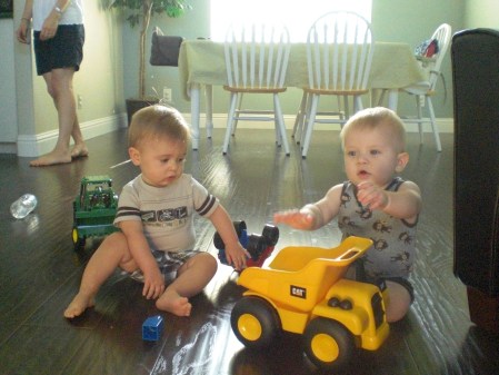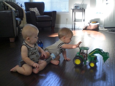 Though Jack has been attending day care for a couple of weeks now, I still have been wondering what it would be like when he would be exposed to another little boy about his age and size, in a different environment. I had these preconceived ideas that it might be difficult for them to get along, fighting over toys. I envisioned myself cringing, just waiting for the moment when one of them would smack the other in the forehead with a wooden block or a Matchbox car.