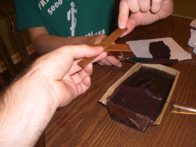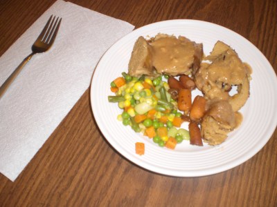 It has remained in a friend’s freezer for nearly nine months, until this past weekend. We decided to have a very belated Thanksgiving dinner… with a “turkey” made of tofu. But that’s not all. A Tofurky comes with stuffing, gravy, a “jerky wishbone,” and even a chocolate cake dessert.