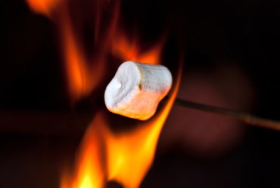 Bottom image: Marshmallow on a stick over the fire, via Shutterstock.