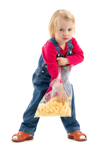 Top image: Kid with snack, via Shutterstock. Bottom image: Two kids and chips snack, via Shutterstock.