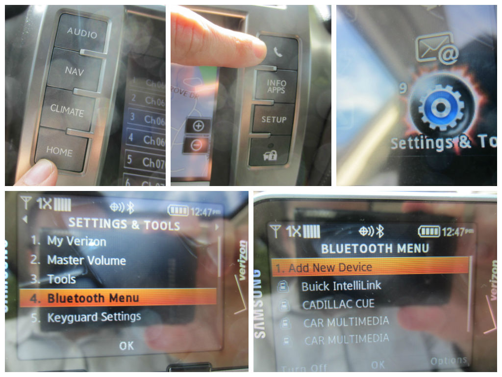 To sync your phone, press “home,” then on the phone symbol. Meanwhile on your phone, pull up the equivalent of “settings and tools.” Find “bluetooth menu” then select “add new device.”