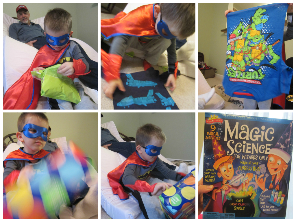 Sort of half-jokingly, I suggested that before you got started opening our gifts to you, that you should dress up in the super hero costume that your friend Madison had given you. (We actually let you open your gifts in front of your friends at your party; even though that’s nearly considered weird these days!)