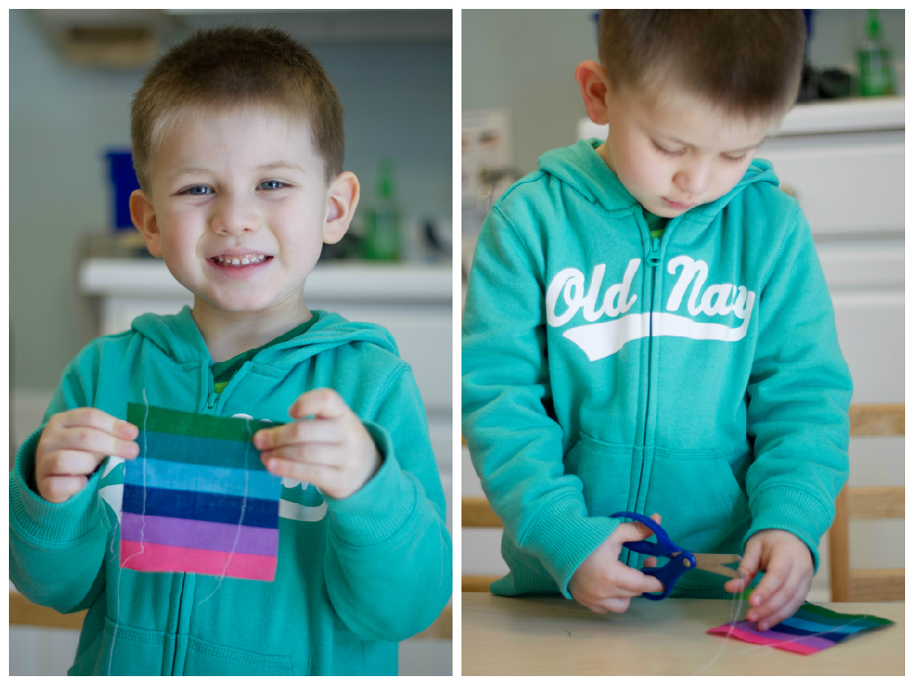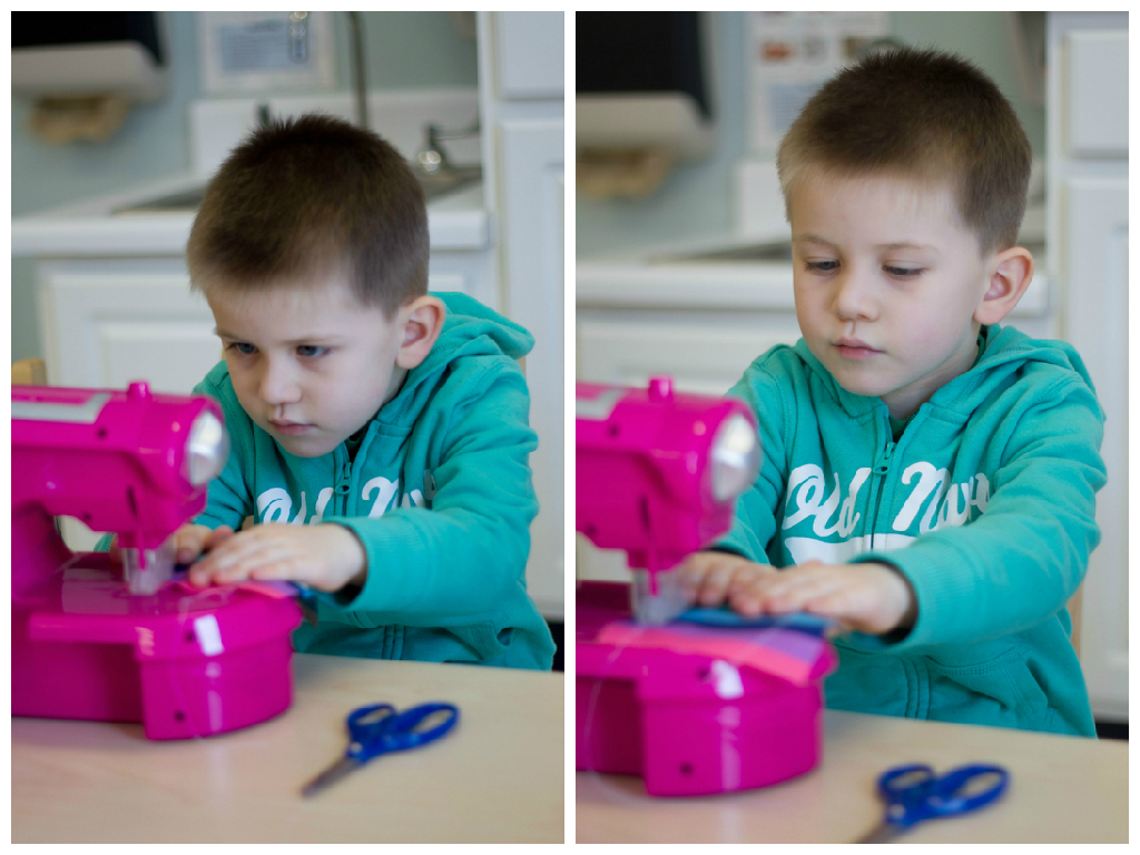 Here are photos of Jack using a sewing machine for the first time! He observed a couple friends do it first, then, became very eager to try. After learning some of the rules (ie: always watch your fingers) he was a sewing pro! He picked out his fabric, and slowly guided it through the sewing machine. After he was done, he loved showing his project off!