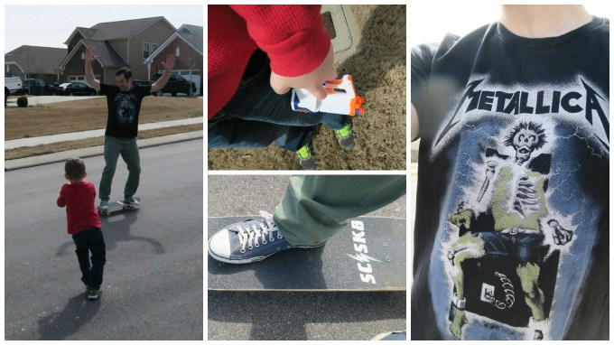 This past weekend while Nonna and Papa were staying with us, they were able to catch a glimpse of a game we recently invented, where I ride my skateboard down the cul-de-sac and you shoot me from our driveway, using your Nerf dart gun. I call our game “shoot-and-skate”.
