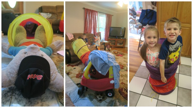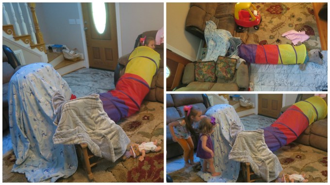 It’s funny to see what happens when you let two almost 1st grader cousins entertain themselves at Nonna and Papa’s house. All it took was a few stuffed animals, a Cozy Coupe, a play tunnel, and the furniture in the living room.