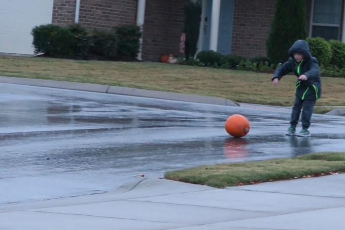 Then you had another fun idea, “Daddy, can I roll the other pumpkin down the hill and see what happens?