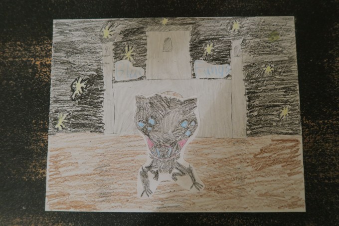 You spent the weekend working very hard to perfect a drawing of Blue Fangs; then you carefully crafted a castle for the creature to stand in front of, as his domain.