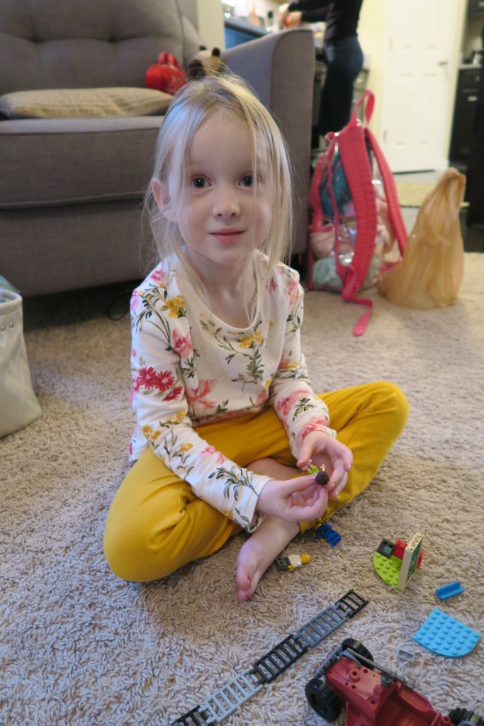 For this past week, we have stumbled into a new tradition in which you and your brother work on Legos while dinner is being prepared. As your brother labors over complex mechanical creatures, you just work with a handful of pieces.