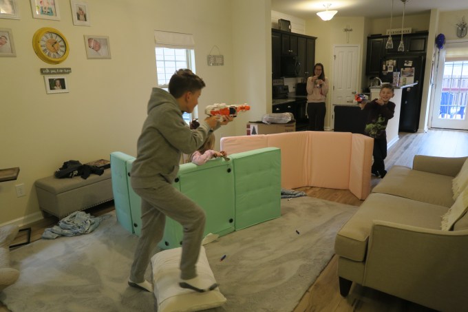 While your sister has been using the new folding cushion beds to make a house downstairs in the living room, you and your friend Levi are using them to construct a military fort; as you shoot at each other with Nerf guns. (Your sister likes to hang out right in the middle of the action!)