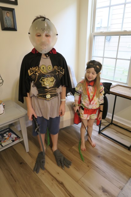 You were both dressed up as some strange mix of superheroes and warriors; weapons included.