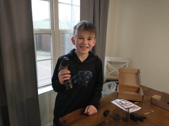 Last week I was saying how Mommy bought you a certain drill you need, to be able to make it easier to rebuild Hot Wheels cars. Well… it arrived this week in the mail, and you love it!