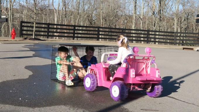 She felt a little awkward by my response, but decided to stick around for the fellowship. A few minutes later, she looked back at the cage situation, and announced, “Oh! Now there is a little girl in a pink Jeep who is running into the cage with the boys in it…”