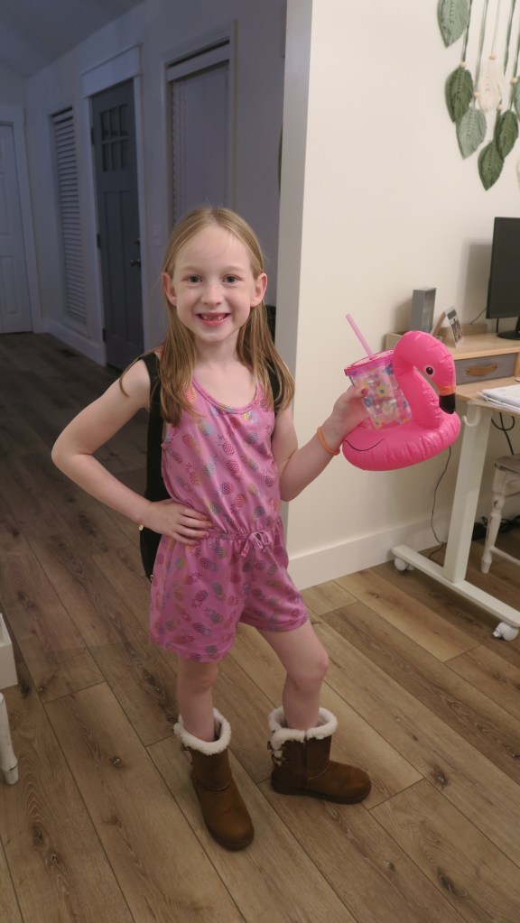 From what I could tell, you had received a new water bottle with a matching inflatable flamingo koozie, cute new boots, and a Squishmallows backpack.