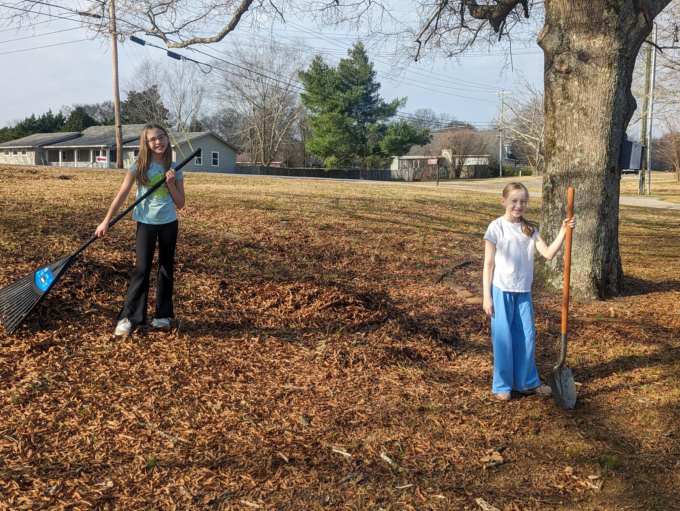 Once we all got back to our house, the sun was out, so you both took it upon yourselves to rake up the leaves that had fallen in our front yard; after I did my final mow for the year.