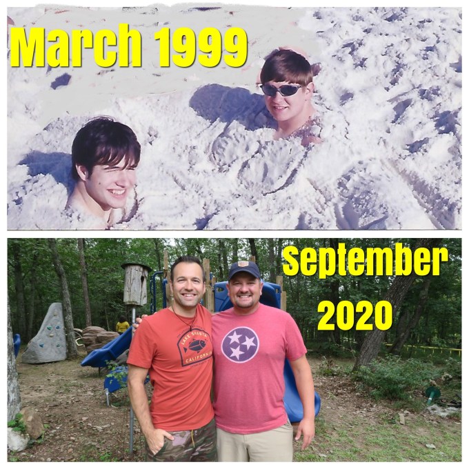 There was also the time, on a very short notice and a whim, that we went on a road trip to Pensacola, Florida our senior year. Our high school had allotted us a few days to go look at colleges and we hadn’t used them up yet. So we hopped on a van and visited a very conservative college that we had no intentions on attending. (See the picture where he and I were buried in the sand from 1999.)