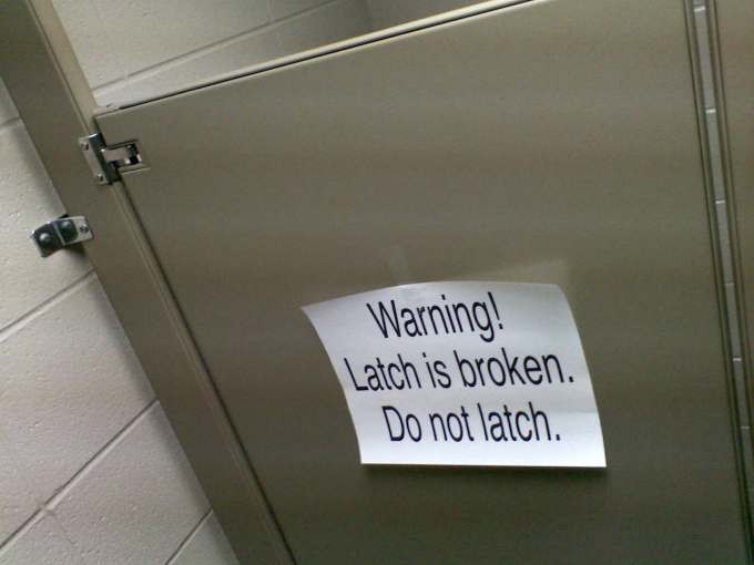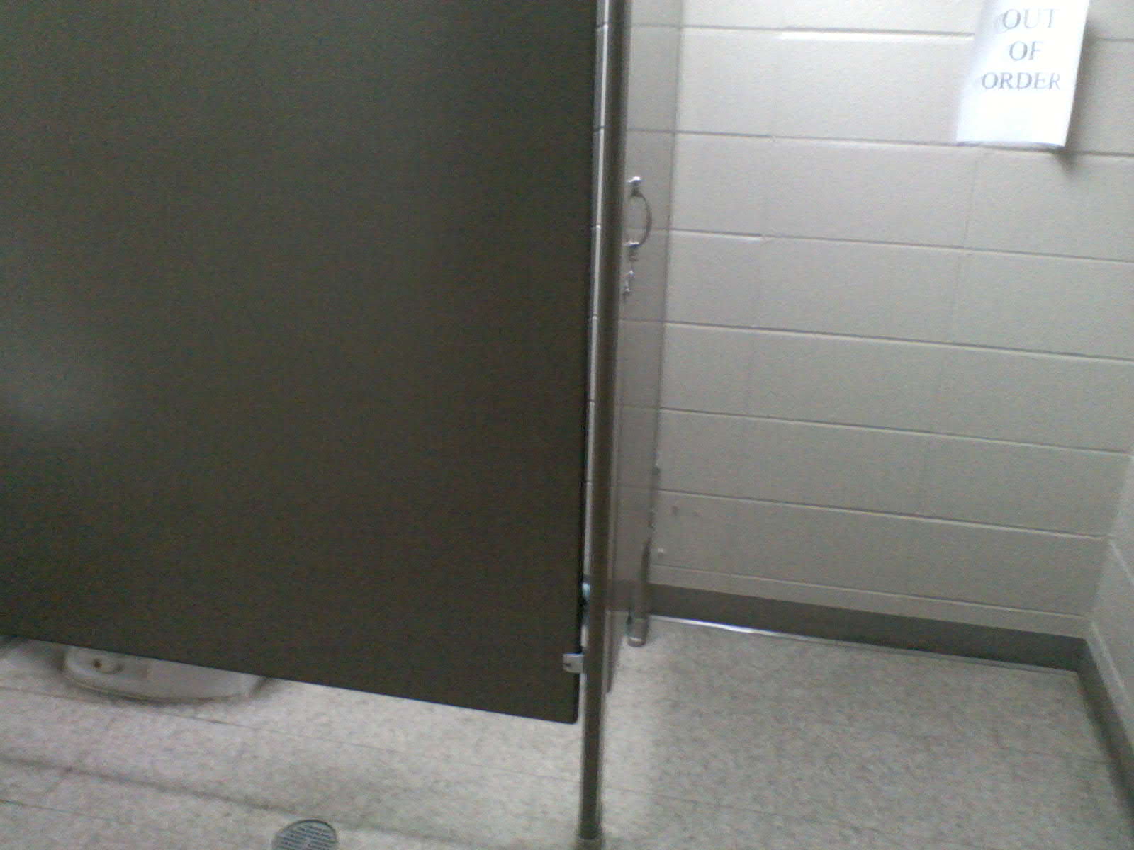The next day, I worked up enough courage to enter the bathroom stall which had a warning sign posted saying that the latch was broken and that I shouldn’t lock the stall door. So I did it anyway. I ignored the sign. Good thing I’m limber. Though the distance from bottom of the stall to the floor was only about 18 inches, I was able to escape. I’m glad, because this particular bathroom is located on the other end of the building where no one ever goes, and besides, I had left my cell phone at my desk.