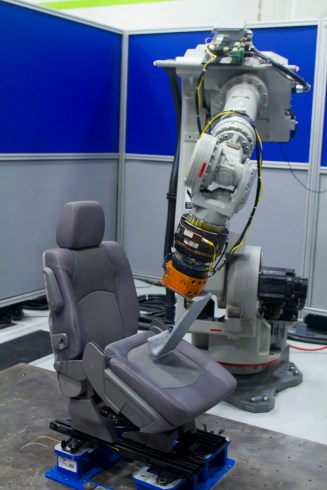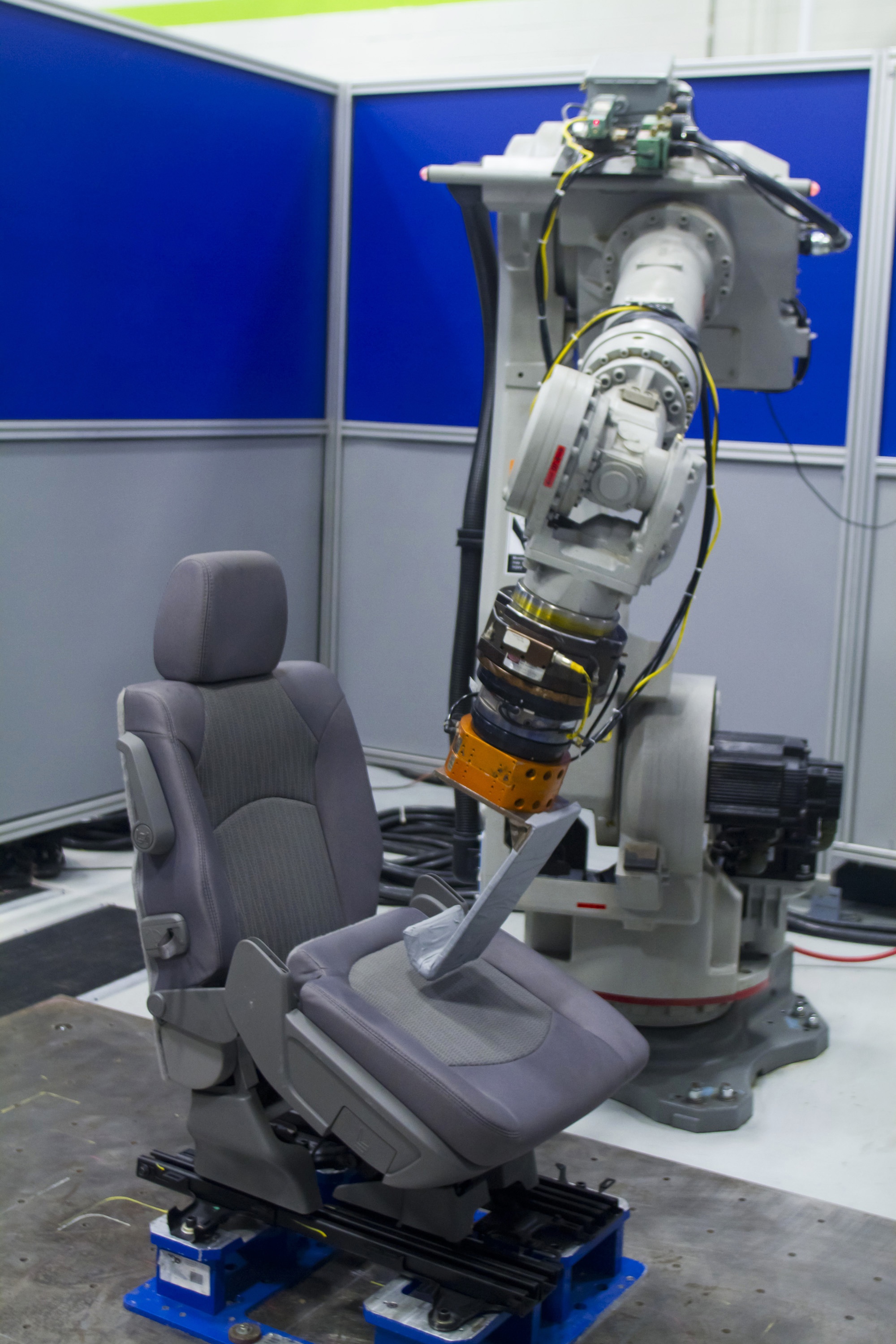 Basically, they have this huge weapon/machine that beats the heck out of the seats. When passengers sit down in a seat, they don’t perfectly place their butt directly down. Instead, they sort of scoot over the side of the seat, then settle into it; day after day, year after year. These seats have to last a long time; therefore, this heavy duty machine does the job of giving engineers an idea of how a seat will look 10 or 20 years from now.