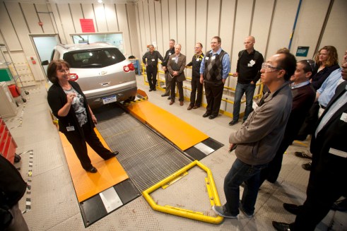By using a “four-post shaker” (featured above), engineers are able to get a good idea of how the Traverse will perform and sound even on the toughest of terrains. It replicates a variety of road surface conditions as each side of the vehicle is suspended at different grades. I got to sit inside the Traverse while they did this test- it reminded me of a ride at Disney World for Honey, I Shrunk the Kids. (That was back in 1990, though.)