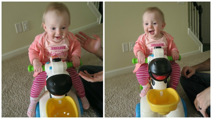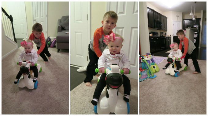 As Jack sees me loading up the car, he knows at point it’s almost time to leave, so he basically plays fetch with you; as he rolls your big pink ball from the living room to the kitchen. You joyfully crawl as hard as you can to go get the ball, before he ultimately gets there before you do and rolls it back to the other room; only for you to happily try to go try to get it again.