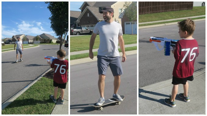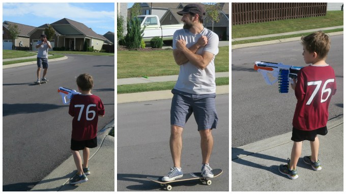 So we took it out to the front yard to test it out. He and Papa (my dad) took turns trying to hit me while I zoomed by on the skateboard. Sometimes I would get hit by a whole row of darts as I sped by, while other times the rhythm of the darts was just right, to wear every single one of them missed me; like the way action heroes can run through a spray of bullets and never get shot.