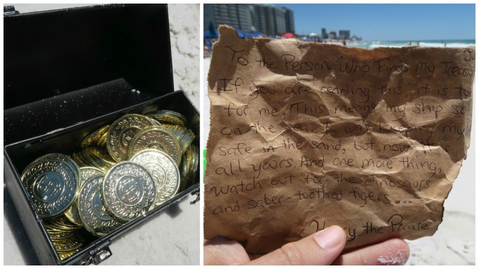 If you are reading this, it is too late for me. This means my ship sank on the sea. I was keeping my gold safe in the sand, but now it is all yours. And one more thing, watch out for the dinosaurs and saber-toothed tigers…